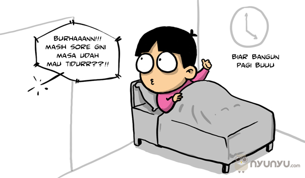 Seringnya kita bangun kesiangan itu karena malemnya kita begadang. Entah begadang ngerjain tugas, pacaran ditelpon sampe lupa waktu (ya gimana nggak lupa waktu, debat siapa yang nutup telpon duluan aja bisa sampe subuh), atau emang iseng aja begadang karena nggak ada kerjaan (dih, aneh banget!).